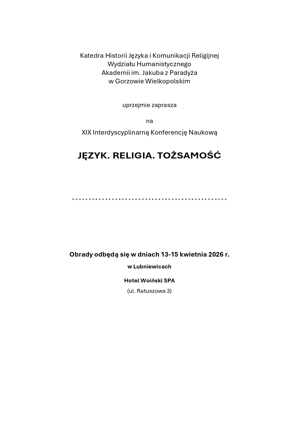 Katedra Historii Języka i Komunikacji Religijnej Wydziału Humanistycznego Akademii im. Jakuba z Paradyża w Gorzowie Wielkopolskim uprzejmie zaprasza na XIX Interdyscyplinarną Konferencję Naukową JĘZYK. RELIGIA. TOŻSAMOŚĆ.