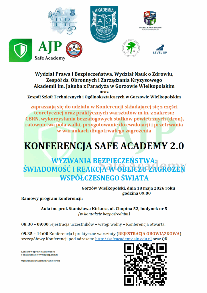 Wydział Prawa i Bezpieczeństwa, Wydział Nauk o Zdrowiu, Zespół ds. Obronnych i Zarządzania Kryzysowego Akademii im. Jakuba z Paradyża w Gorzowie Wielkopolskim oraz Zespół Szkół Technicznych i Ogólnokształcących w Gorzowie Wielkopolskim zapraszają się do udziału w Konferencji składającej się z części teoretycznej oraz praktycznych warsztatów m.in. z zakresu: CBRN, wykorzystania bezzałogowych statków powietrznych (dron), ratownictwa pola walki, przygotowanie do ewakuacji i przetrwania w warunkach długotrwałego zagrożenia KONFERENCJA SAFE ACADEMY 2.0 WYZWANIA BEZPIECZEŃSTWA: ŚWIADOMOŚĆ I REAKCJA W OBLICZU ZAGROŻEŃ WSPÓŁCZESNEGO ŚWIATA, która odbędzie się 18 maja br. o godzinie 9:00.